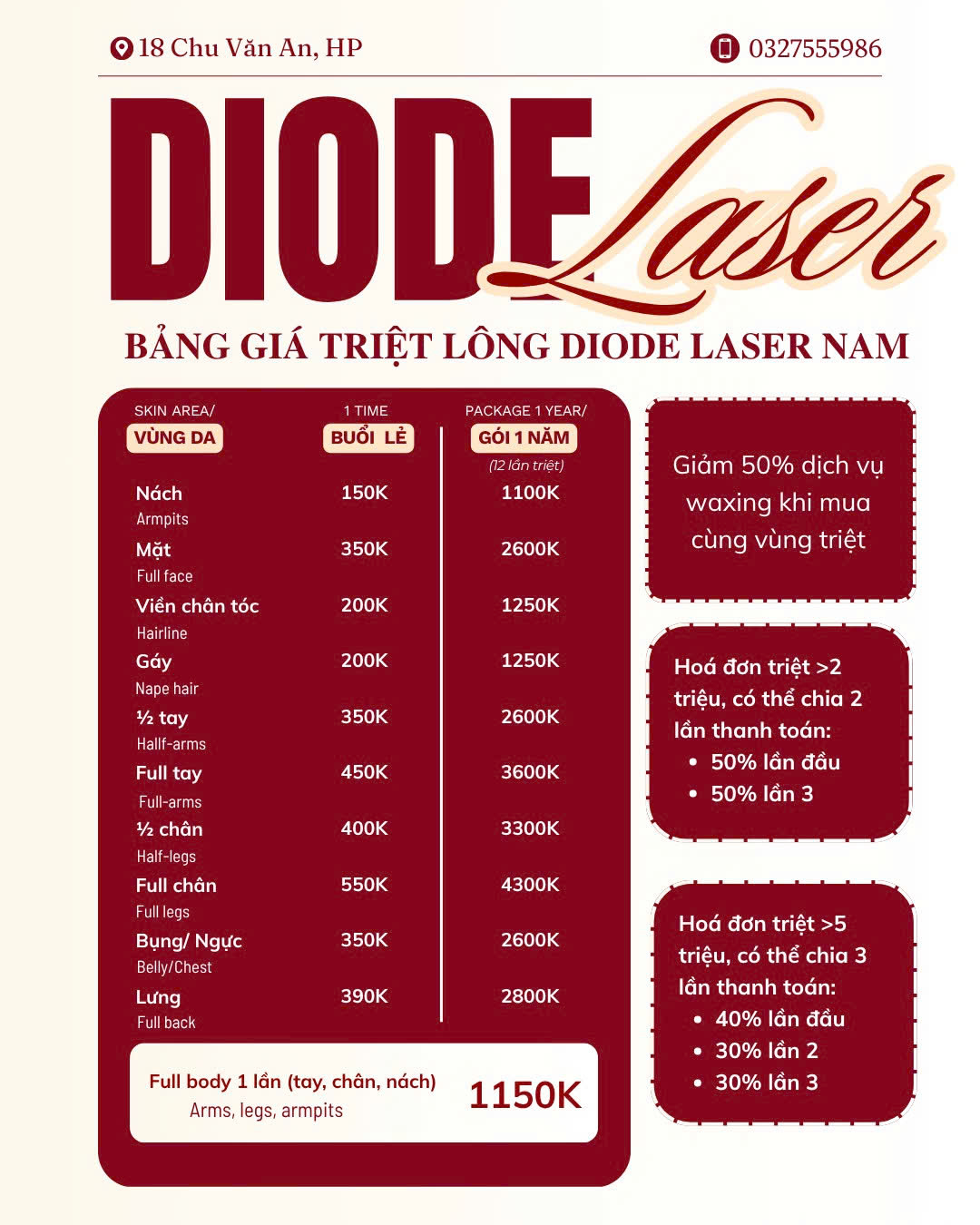 - Đáp ứng mọi nhu cầu của bạn bao gồm: triệt buổi lẻ & gói triệt theo năm
